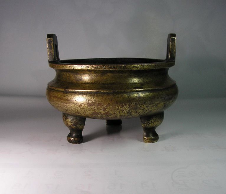 玩炉藏炉数载,我有幸收藏到这尊鼎式铜炉,它的外型是参照商周青铜鼎的形状发展演变而来的,因此它既有青铜鼎的大气厚重,同时又具有了宣德炉的儒雅端庄。这炉铜质精良,做工精到,通体鎏金,虽岁月让它斑驳沧桑,却依然难掩曾有的富丽辉煌;在炉底有两个结体俊朗、书风古雅的大篆体款字。整尊铜炉虽不大,却透出稳重古朴、厚实沉雄的气韵。